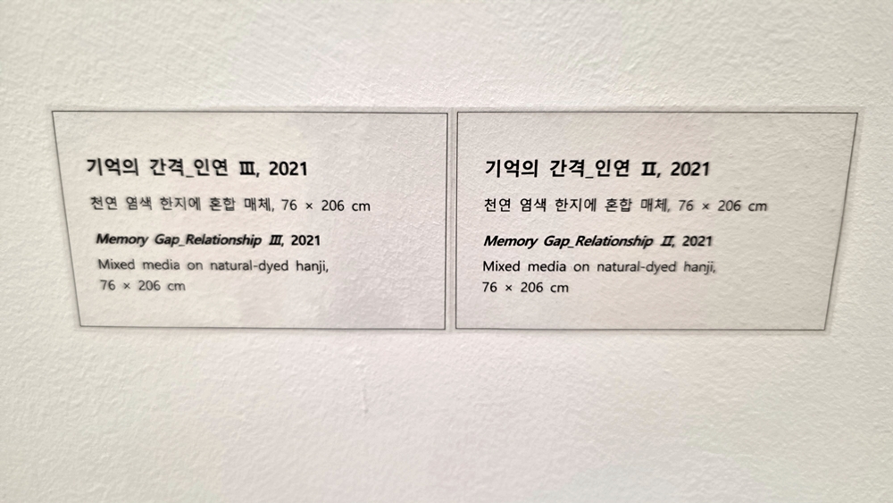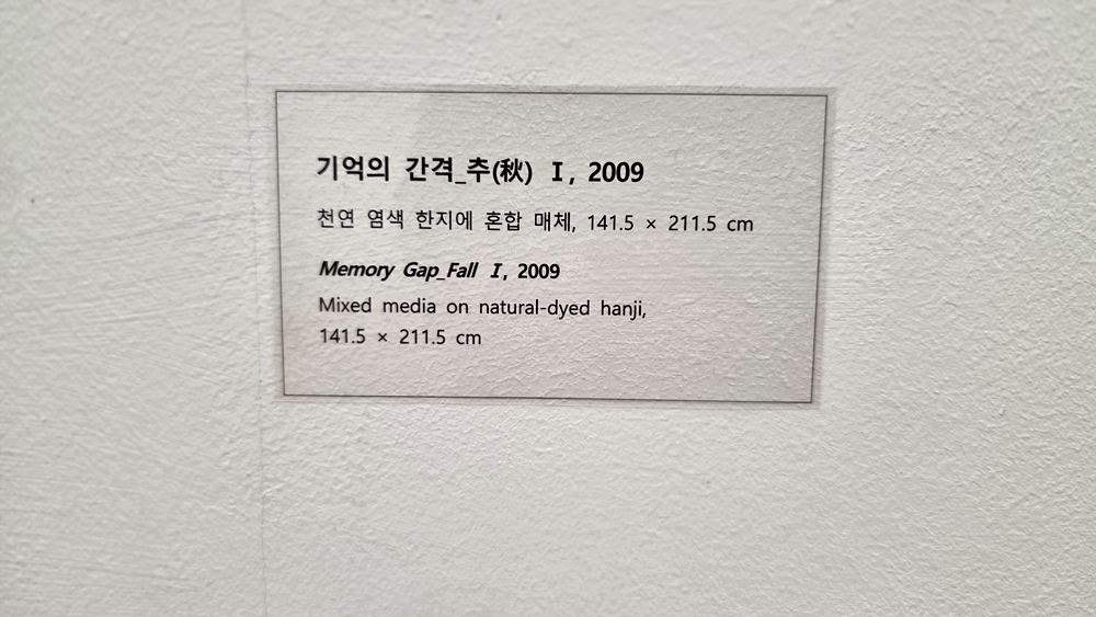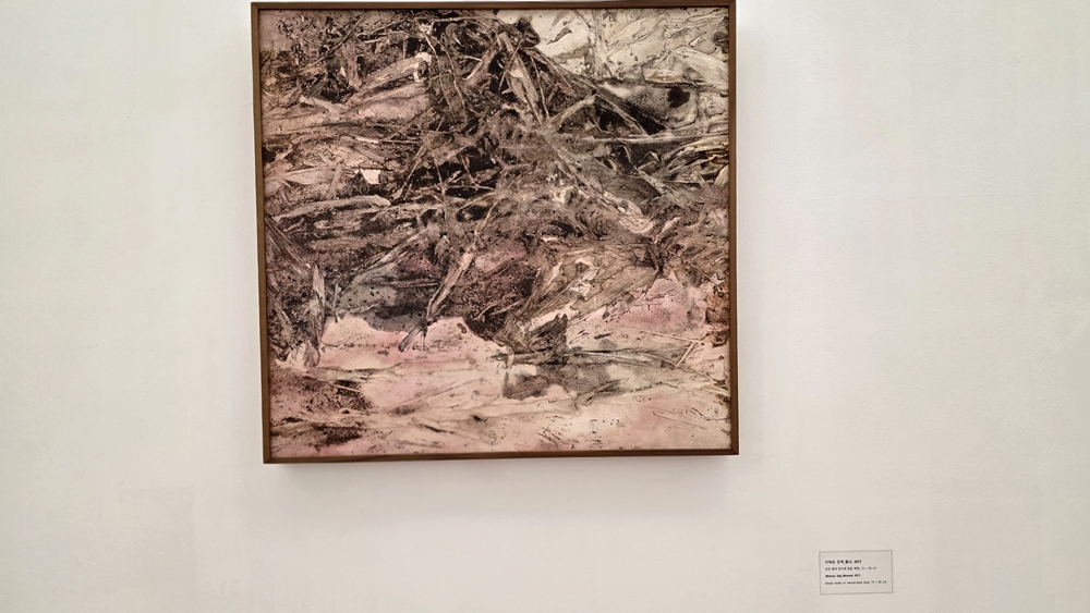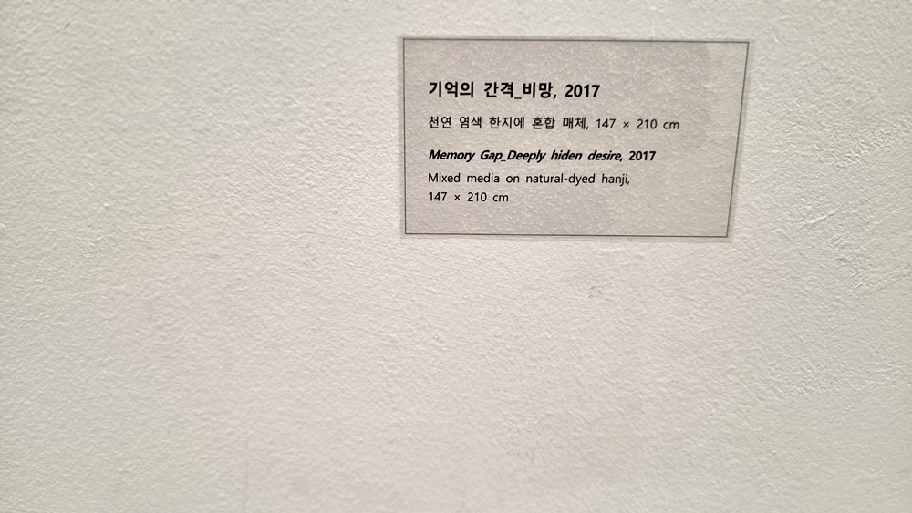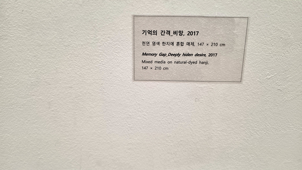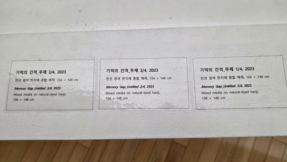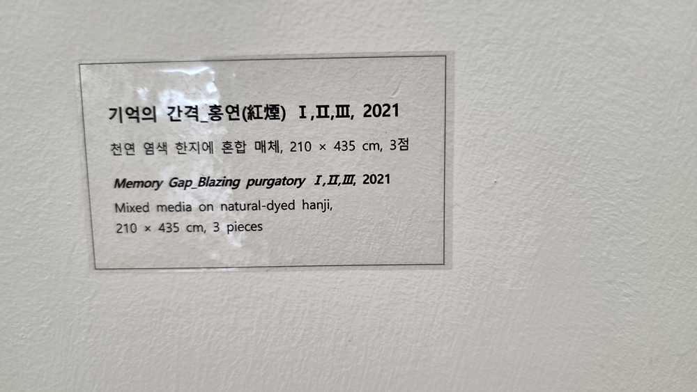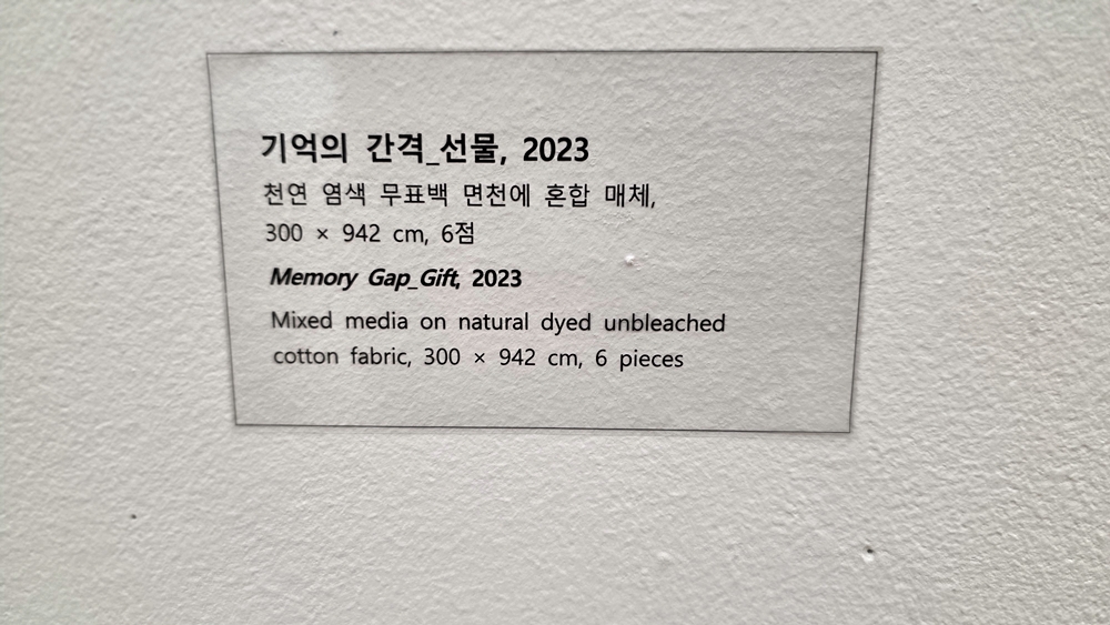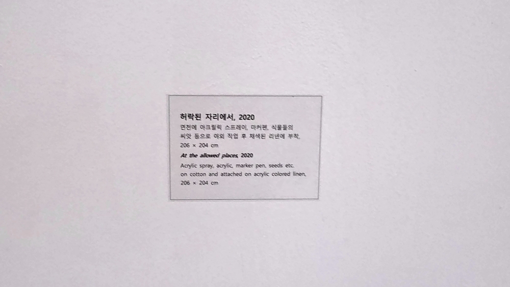 작가는 여러 지역을 다니며 자연의 현장에서 찾아낸 소재들을 종이와 천으로 된 바닥에 스며들게 하는 퍼포먼스를 한다. 이후 작가는 평면에 남겨진 그 흔적들을 오래 두고 바라보며 그 위에 무언가를 더할지 혹은 더하지 않을지를 결정하는 과정을 거쳐 작업을 완성한다, 너무 방대한 대작들로 제목부터가 난해하다