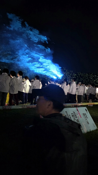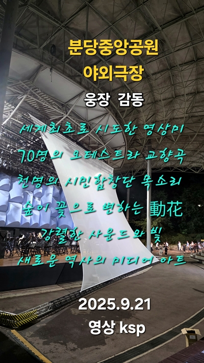 중앙공원 야외 공연장에서 야간에 <시네 포레스트 동화(動花)>라는 주제로 열렸는데 분당 중앙공원의 울창한 숲을 단순한 배경이 아닌 공연의 주체적 공간으로 전환하는 세계 최초의 시도를 보게 된 것이다. AI가 앞으로 어떻게 진화 할지, 빠르게 다가 온 그의 시험 무대를 나는 목격한 것이다.